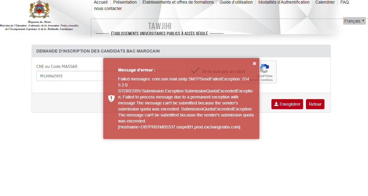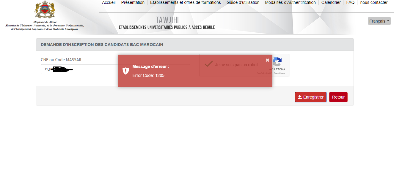 انا حاصل على باك 2018 وعند دخولي لموقع التسجيل في المدارس العليا للتكنولوجيا اصادف عند كتابة رقم الخاص بي برسالة Error Code: 1205 او رسالة