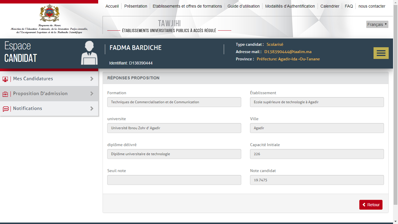 السلام عليكم المرجو مساعدتي ففي واجهة الموقع الدي يخص الترشيح في est لم اجد زر الاجابة على اقتراح الولوج الى est oujda وهده المدينة بعيدة فبعد مرور الوقت وجدت ان تمت الموافقة على الاقتراح وانا لم اقبله فحذفت لي قائمة لوائح الانتضار