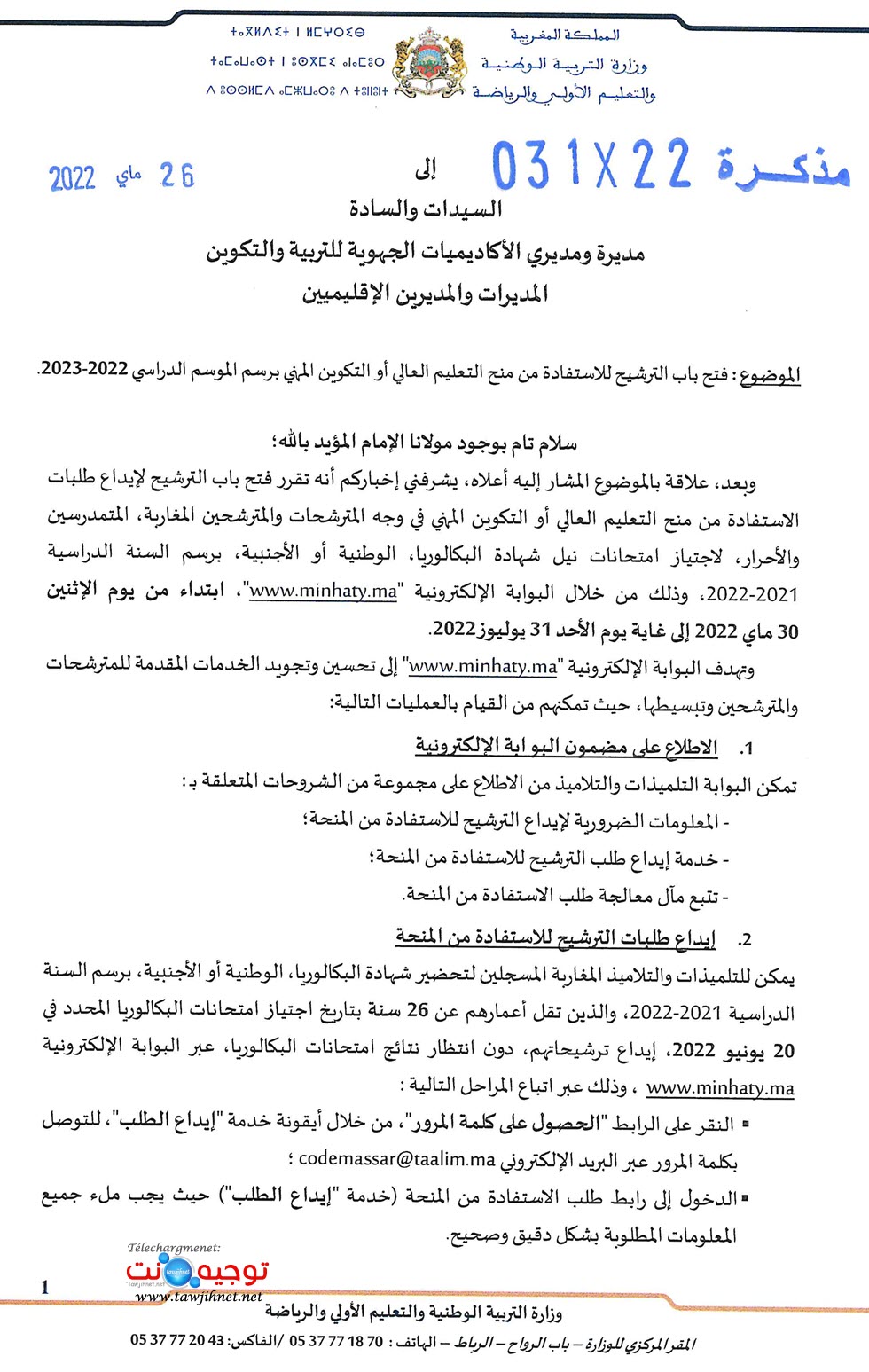 فتح باب الترشيج للاستفادة من منحة التعليم العالي والتكوين المهني برسم الموسم الجامعي والتكويني 2022-2023
