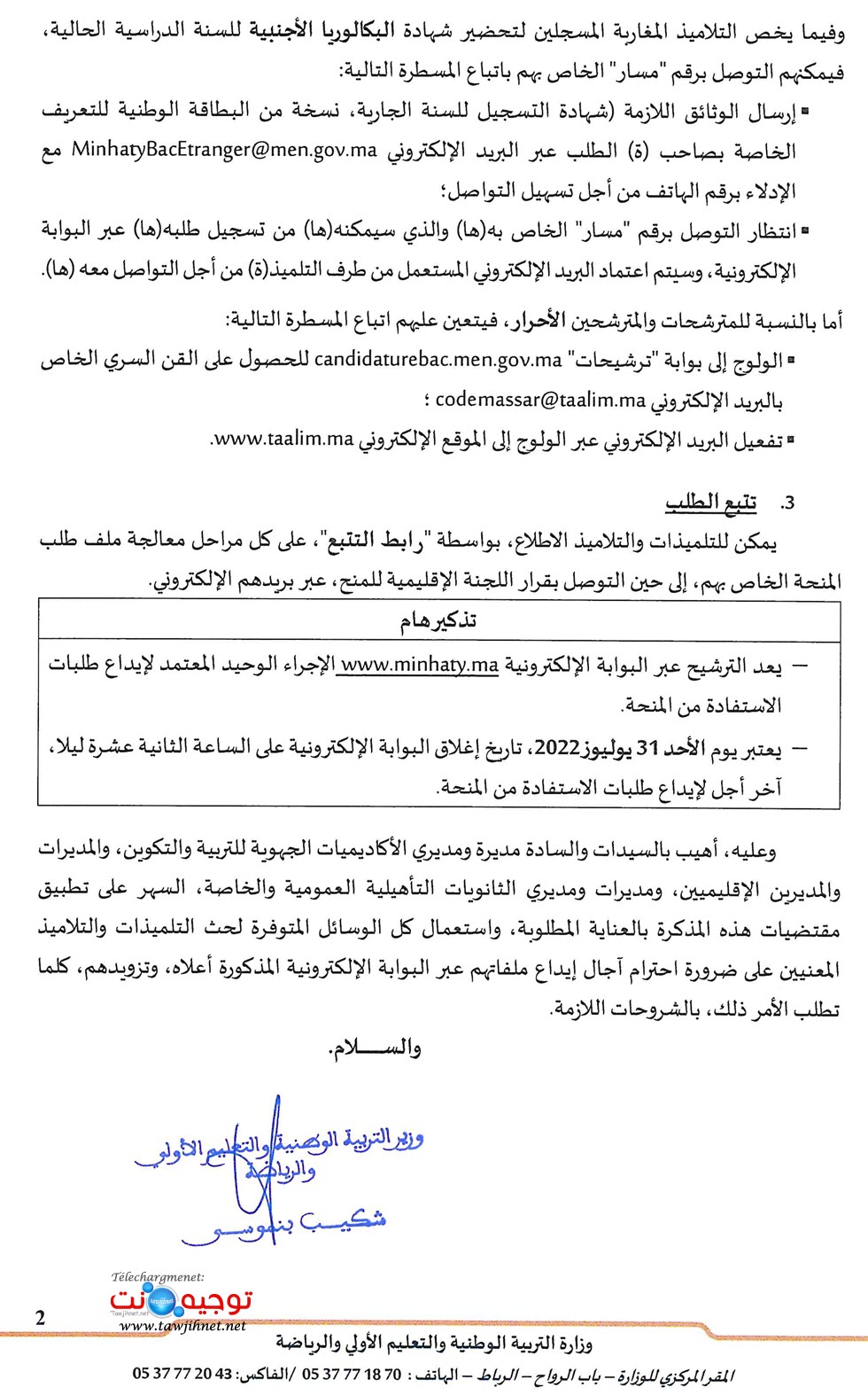 - فيما يخص الطلبة المغاربة الحاملين لشهادة الباكالوريا الأجنبية، للسنة الدراسية الحالية، هناك بعض الاجراءات التي يجب القيام بها كما حدد دلك في المذكرة الوزارية أسفله