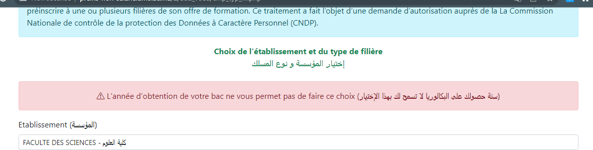 السلام و عليكم انا تلميذة حاصلة على شهادة الباكالوريا شعبة علوم حياة و الارض بسنة 2022 اريد الالتحاق بكلية العلوم جامعة محمد الخامس بالرباط لكن لم انجح في تسجيل معلومات الالتحاق لهذه الكلية يقال "سنة حصولك على البكالوريا لا تسمح لك بهذا الإختيار" لماذا ذالك